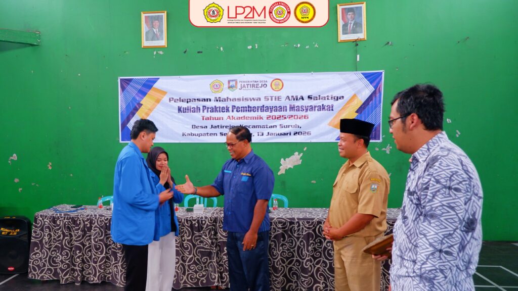 Selasa. 13/01/2026 – Ketua STIE AMA Salatiga Dr. Pandi Afandi SE., M.Si melakukan pelepasan kegiatan Kuliah Praktek Pemberdayaan Masyarakat (KPPM) didampingi oleh Sekretaris Desa Jatirejo Bapak Wisnu Aminudin, S. Pd.i dan Kepala LP2M STIE AMA Salatiga Bapak Mokhammad Khukaim Barkhowa SE., MM.